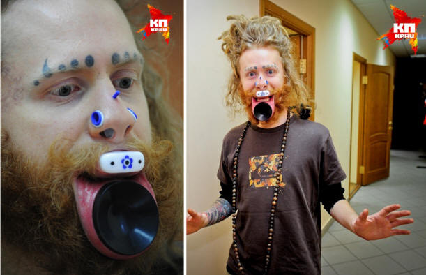 Evgeny Bolotov je modifikátorem těla, experimentuje s ním vzhled. Má na rtech talíře, spodní část je natažena o 60 mm, horní o 33 mm. A plánuje je natáhnout „do nekonečna“. Natahuje se a ušní lalůčky, dělal tunely v nose a nyní mezi nimi i tužka může klidně projít nosními dírkami. Také probodl nosní chrupavka a nyní se jeho nos ohýbá jako plastelína. Zhenya velmi hrdý na to, že je jediným majitelem takového piercingu na planetě. – Ne, děti neplakají, – směje se 27letému Permu – Lidé někdy ukazují prstem, usmívají se při pohledu žádají mě, abych s nimi vyfotil. Pravda, ten si stěžuje: in nebezpečné Perm oblasti mají obličej jen pro případ zavřít. Stále není jasné, jak se skuteční chlapci setkají, pozdravit temná ulice: ne každý v Uralu to chápe a přijímá “krása”.