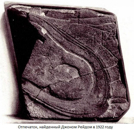 Tento tisk našel v roce 1922 v Nevadě geolog John Reid a inženýr. Profesoři z přírodovědného muzea a Kolumbie univerzity, na které Raid ukázal artefakt, vysvětlili vše „hru“ příroda. “Ale nikdo nezpochybnil věk fosílie – jak nejméně 200 milionů let, pak všichni odborníci byli jednomyslní. V Podle Rockefellerova institutu byla provedena mikroskopická analýza výsledky kterých odborníci dosáhli verdiktu: otisk jasně ponechána uměle vyrobená položka.