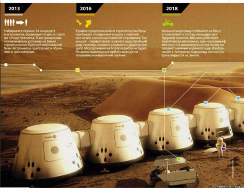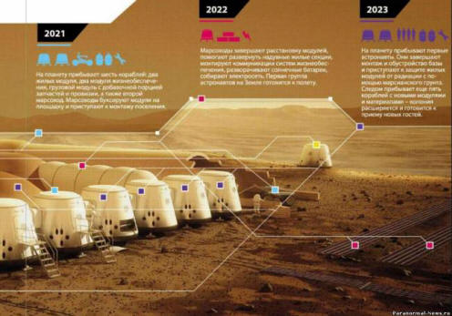 V lednu 2016 s kosmickou lodí Podrobnosti o první marťanské základně na palubě. A v roce 2022 na palubě první emigranti vypluli na stejnou loď a byli připraveni opustit svou domovinu planeta navždy. Dosud málo známá společnost z Nizozemska Mars One vyzývá občany, aby hlasovali pro dobytí Marsu. V v případě úspěchu nizozemští podnikatelé slibují v roce 2016 položil první kámen budoucí kolonie na Marsu a v roce 2023 usadit se v něm první emigranti.