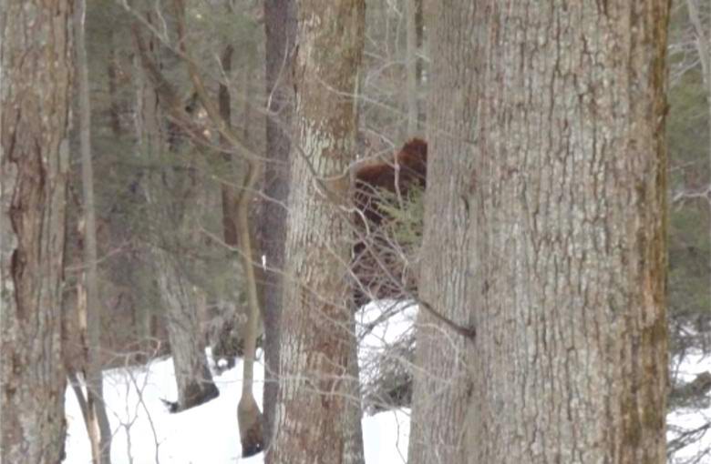 Snímek pořízený mužem ukazuje zasněžený les. Rovně mezi dvěma stromy v pozadí je vidět vysoko opičí postava s načervenalými vlasy. Skeptici si to jsou jistí toto je obyčejný mechový pařez, ale svědek tvrdí, že stvoření rychle prošel lesem a hlasitě se skřípal sněhem, co to je pařez?