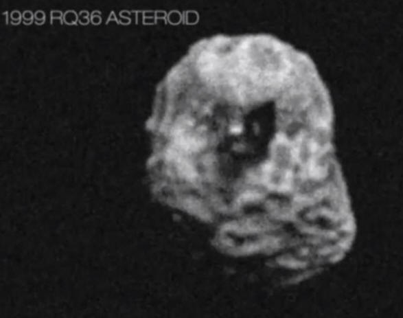 Na internetu se objevily zvědavé záběry. Na nich je asteroid 101955, aka 1999 RQ36. Asteroid se otáčí. A stane se to je vidět: černá pyramida z toho vyčnívá. Je jasně vidět šedě pozadí samotného asteroidu. V pyramidě jsou čtyři tváře, horní část je plochá. Na jedné z tváří je jasný obdélníkový bod. Jako by okénko.