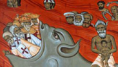 Jméno autora nástěnné malby zůstává neznámé. Obrázek Jugoslávský komunistický vůdce Josip Broz Tito Karl Marx a Friedrich Engels na zdi kostela provokovali vzrušené diskuse v Černé Hoře. Na fresce všichni tři hoří v moři peklo mezi hříšníky a ďábelskými zvířaty. Kostel Vzkříšení, ve kterém byla tato nástěnná malba vytvořena, se nachází v hlavním městě Černá Hora Podgorica. Ona je také kritizována za příliš pompézní architektonický styl. Kritici říkají, že církev by neměla zasahovat do politiky.