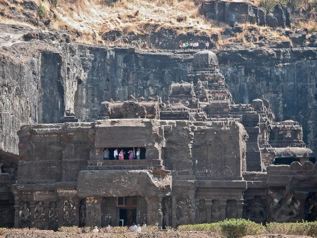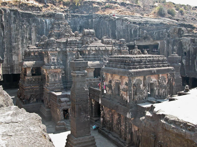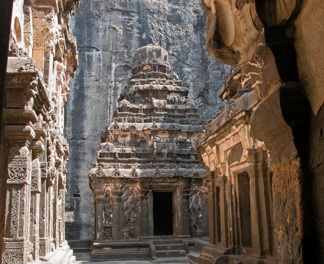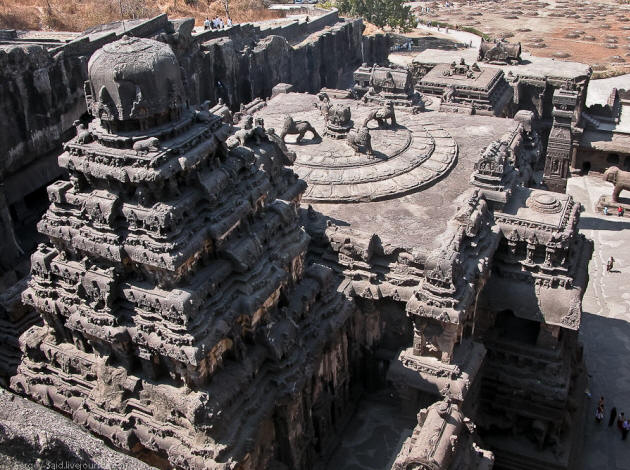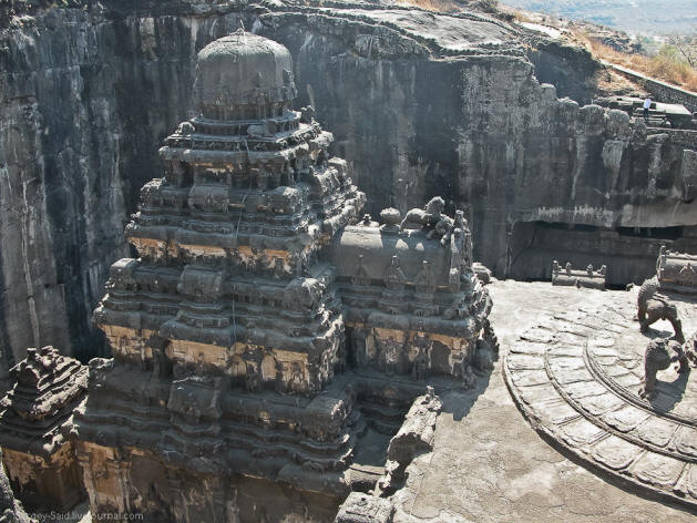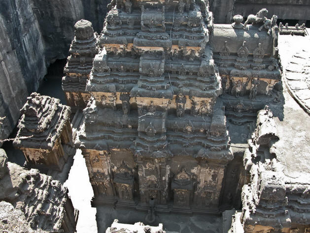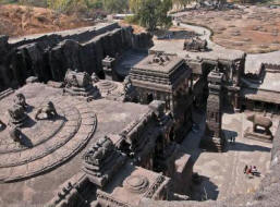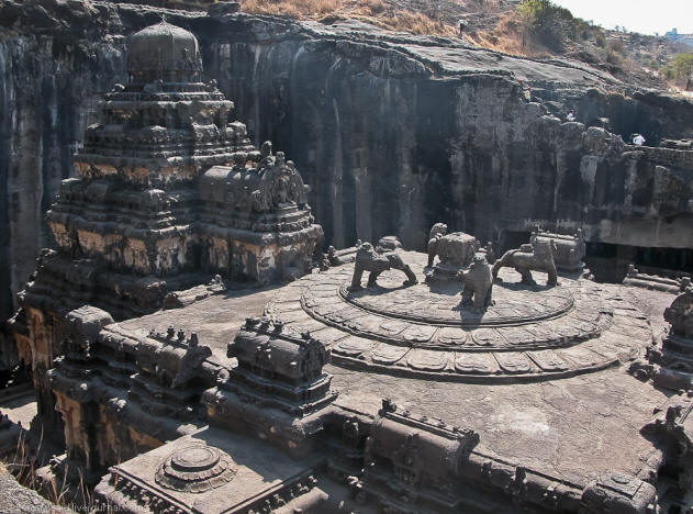 Ani ohromující jeskynní chrámy Ellory nejdou jaké srovnání s ústřední náboženskou stavbou údolí – Chrám Kailasanath (nebo jinými slovy Kailash), vytesaný do monolitický osamělý kámen.
