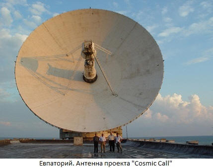 Kosmické volání a poselství pro děti Jako součást projektu Kosmická výzva v roce 1999 opět z ECDS ve 4 relacích bylo poslal více než 50 000, rozdělených do 2 bloků. První obsahoval čistě vědecké informace (jako „poselství Areciba“) a druhá – osobní zprávy každého, kdo za to mohl zaplatit. Letěl do vesmíru dokonce „Brazílie je šampión!“ Byl poskytnut takový zajímavý krok financování projektu. V roce 2003 byl encore experiment opakoval. V roce 2001 znovu od Evpatoria zprávu, která měla – komplexní struktura obsahující hudební fragmenty, obrázky a texty. Proto byly do projektu zapojeny děti pro reklamní účely tato mezihvězdná zpráva zůstala v historii jako „Děti“ „Z posledních propagačních akcí si můžete poznamenat„ Zpráva ze Země “ (9. října 2008) a „Dobrý den ze Země“ (28. srpna 2009). Bylo jich víc akcie, ale už to byla čistá show kvůli čerpání peněz, ne bez vědecké hodnoty.