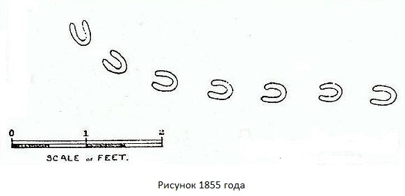 Lidé se začali shromažďovat. Stopy byly podlouhlé hladké řetěz po sobě jdoucích ve vzdálenosti 20-40 cm kopyta kopyta o velikosti 10×7,5 cm tak, že stvoření, které je opustilo, nebylo čtyřnohým, ani dokonce dvounohé a jednonohé!