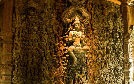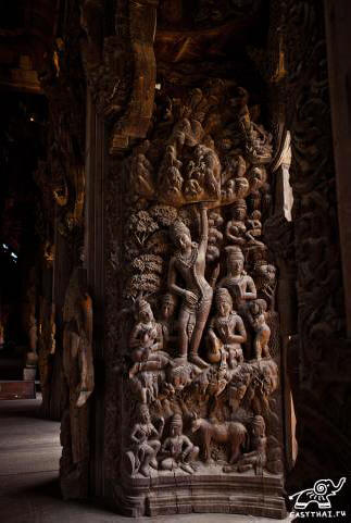 Fotografie z otevřených zdrojů Celkem v chrámu 170 plné sloupy z obrovských stromů. V Thajsku věří, že v každém stromě žije duch, a když strom umírá – duch opouští ho. Podle průvodce je zde v chrámu Pravdy sloupec obří strom, který duch neopustil. Thajci to nazývají duchem Ta Kien a přineste mu oběti. Krása chrámu pravdy průvodce říká, že každé křídlo chrámu pravdy obsahuje obrázky týkající se buddhistických a hinduistických náboženství a mytologie Kambodže, Číny, Indie a Thajska. Samozřejmě člověk nezasvěcený do východní kultury a filozofie je těžké to rozeznat, vidí víc a pohlcuje krásu. Ale je tady? Sochy jsou často nepřiměřené, sestavené neslušné, prý starožitné, ale při pohledu na ně nepřijde hlava kreslí analogii se sochami Angkor Wat nebo jiných Khmerské obrázky. Zdá se, že je to jen salát soch a vzorované vlákno. Je zajímavé, že píše o sabay-sabay této atrakce: “Vyrobeno výhradně ze dřeva a tence vyřezávané, tato budova je plná náboženských a filozofická pravda a ukazuje, čeho člověk dosáhl civilizace “, – je napsáno v letáku. Opravdu. Některé části chrámu se už třicet let otevřeně hnízdí, jiné se staví, ostatní se obnovují. Chrám jako malá kopie lidská civilizace. Nepředstavuje jediné náboženství pokus spojit národní a náboženské tradice sousedů “Tak přesně a lakonicky autor popsal význam.” tato struktura, která je představována očitým svědkům.