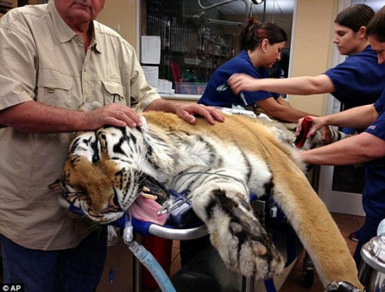Fotografie z otevřených zdrojů byl sedmnáctiletý tygr jménem Tai operoval ve středu ve veterinárním středisku v oblasti Tampa Bay. Jak lékaři řekli po operaci, byli schopni bezpečně odstranit dva kilo překážky od žaludku Taya. Tygr, o který se stará Záchrana volně žijících živočichů a Rehabilitati) v Seminole, obrátil se na veterináře o pomoc poté, co zvíře odmítlo jídlo pro téměř dva týdny.