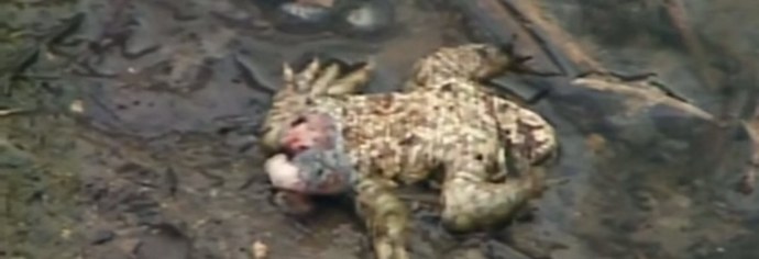 Je to jako hororový film, říká ekolog z Hamburku Werner Smolnik, jen si představte, že tělo ropucha v tento okamžik se třikrát až čtyřikrát zvýší a pak praskne.