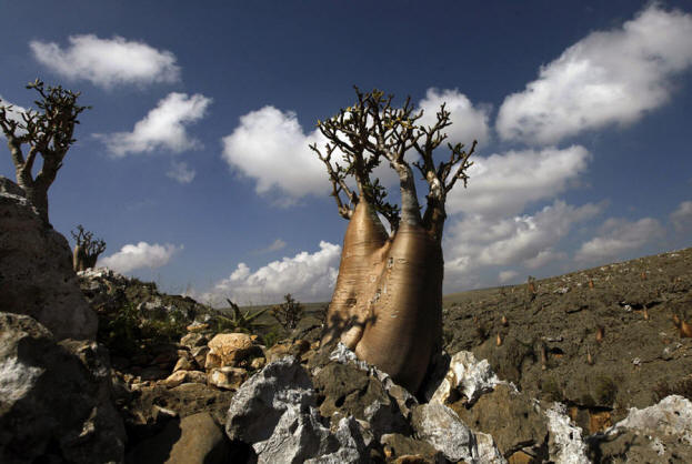 19. Socotrian pouštní růže, jejichž masivní kmeny přizpůsobený k ukládání vody na svahu ve Wadi Dixam Ostrov Socotra, 19. listopadu 2013. (Reuters / Mohamed al-Sayaghi)