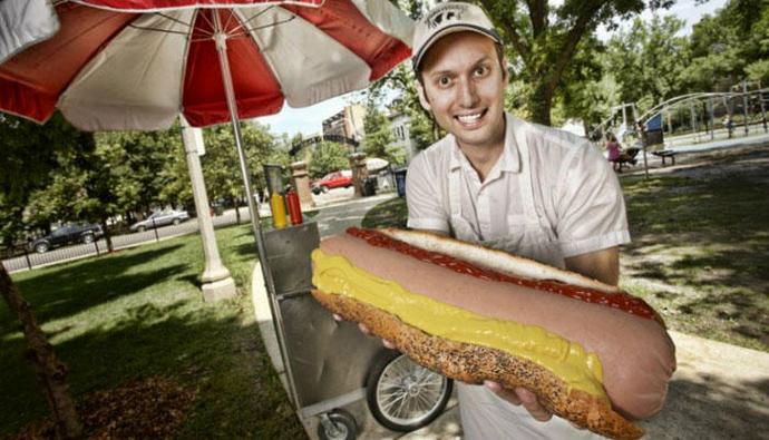 V záznamech takového plánu nebylo možné obejít se největší hot dog, který vařil Američan Dan Ebbet v roce 2011. Tento „sendvič“ vážil více než tři kilogramy a měl délku čtyřicet jedna centimetr. Mimochodem, nebyl jediný a ten den mohli obří hot dogy koupit za čtyřicet dolarů a jíst s, řekněme, společností přátelé.