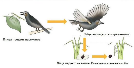 Jak zjistili japonští vědci, až 20 procent lepených vajec uložené v jícnu ptáků kvůli jejich silné skořápce, více Navíc, protože tyto hmyzy jsou schopné parenogeneze (vývoj embryo z nefertilizovaného vajíčka), pak úspěch takové strategie reprodukce a distribuce jsou zřejmé.