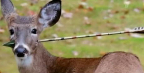 Dvakrát šťastná oběť pytláka v New Jersey. Mocný šíp z kuše zasáhl jelena, ale uvízl v hlavě, ne poškození mozku a nezlomení jediné velké nádoby.