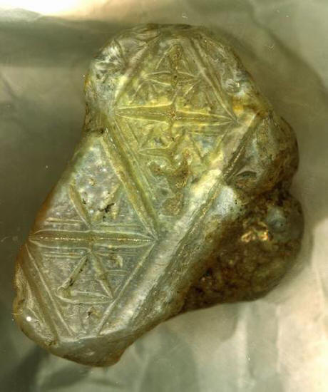 Mezi těmito kousky křemence jsou, podle nejméně dva. Jeden z fragmentů (na obrázku) obsahuje 4 symboly uzavřené v trojúhelnících (jsou párové a sekvenční) propojený vnitřním významem), druhý má menší velikost a více poškodilo – rizika trojúhelníků a vnitřních obrazů částečně číst.