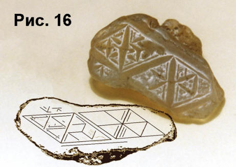 Tyto symboly, ve formě stuhy nebo geometrické figury, mohly být 22. Pak jsou čtyři trojúhelníky na objeveném kameni fragment kosmogonie (pronikání ducha do hmoty, výskyt Z vesmíru). Pokud byly trojúhelníkové znaky uzavřeny více velké rovnostranné trojúhelníky, pak tam byly dvě takové postavy, a celkový počet znaků – 36 + 36 (72 geniálů, 72 anděl, 72 jmen Boha, 72 mudrců atd.). Vězni ve znakech znalost je tak stará a tajná, že se také stala tajemstvím na dlouhou dobu.