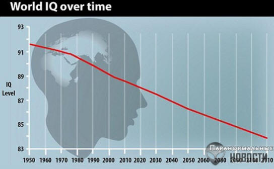 Richard definoval průměrné hodnoty – takové světové úrovně inteligence v průběhu let. A zjistil, že do roku 2014 IQ klesl téměř o 3 body z úrovně 1950. A pokud hloupost pokračuje při současném tempu pak do roku 2110 IQ lidstva klesne pod 84 body. A to bude znamenat, že se to mentálně stane průměrný.