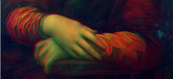 To znamená, že da Vinci nepřistoupil k problematice 3D obrázků pouze teoreticky, ale také experimentováno v praxi. V pozorování původních barev těchto dvou obrazů je patrné že jediný skutečný rozdíl je pouze na rukávech Mona Lisa. Zapnuto na jednom obrázku mají rukávy načervenalý odstín a na druhém obrázku – nazelenalý. Někteří odborníci naznačují, že tato barva rozdíl je náznakem Leonarda, který jeho obrazy potřebují podívejte se přes červeno-zelené brýle. Jiní věří, že všechny tyto fakta nejsou důkazem úmyslu vytváří pro jeho Giocondu stereoskopický efekt da Vinci. Například rozdíly mezi dvěma obrázky v jiných částech těla, jako není v rukou, není vhodný pro vytvoření stereoskopického páru. Kromě Navíc skutečnost, že rozdíly v do značné míry orientované svisle spíše než vodorovně, jak by mělo být. Ideálně horizontální nerovnováhy by měly vytvořit správný 3D dojem, hlavně nachází v oblasti rukou Mona Lisa. Je to součást obou obrazy lze označit za nejúžasnější a nejzajímavější oblast trojrozměrného efektu, zvláště když si uvědomíte, že Mona Lisa byly vytvořeny začátkem 16. století.