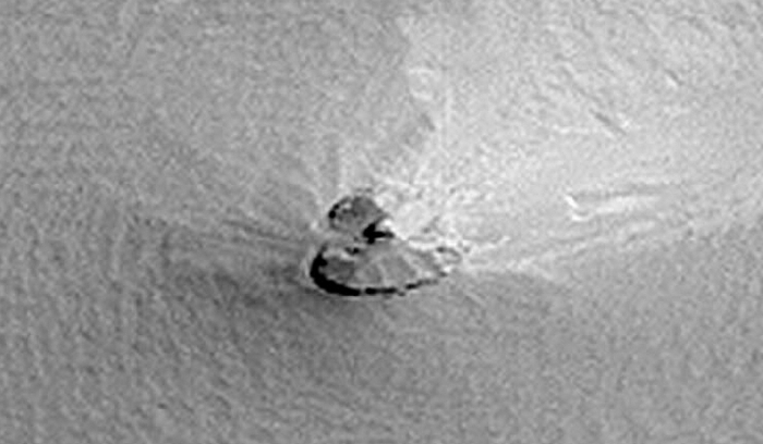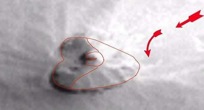 Údajná loď zástupců mimozemské civilizace nachází se poblíž Mount Elysius na sopečném marťanském území Tarsis region. Tajemná fotografie byla pořízena v roce 2000. Americká výzkumná stanice bez posádky „Mars Global Surveyor, “zahájena v listopadu 1996 a považována za ztracenou v roce 2006 Leden 2007 Přestože je zařízení již devět let staré ztracené, jeho obrazy Marsu stále okupují mysl ufologů z celé země. Vědci jsou toho přesvědčeni obrázky mohou skrývat tisíce zvědavých podrobností, vyvrací společnou hypotézu, že Rudá planeta není osídlen nikým.