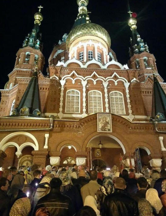 Foto z otevřených zdrojů Obrázky, na nichž se nachází jedna z kopulí chrám poblíž se zlatým křížem je jasně viditelný karmínově pohon vyrobený v době, kdy byl právě u konce náboženský průvod. Ve stejné době, Metropolitan Izhevsk a Udmurtia Nikolay pozdravil stovky lidí na naší planetě, kteří se shromáždili poblíž chrámu obvyklého: „Kristus je vzkříšen!“ Odpověď byla: “Opravdu vstal!”