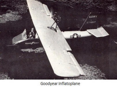 V roce 1959 postavil Goodyear Tire nafukovací letadlo. Všechny letoun s motorem a kabely se vejde do 1,25 m kontejneru. krychle Dvojitá rovina nafouknutá za 5 minut kompresorem a jeden model – s pumpou na kola. Myšlenkou vývojáři, měl být Goodyear Inflatoplane prostředkem záchranní piloti sestřeleni ve Vietnamu a padli na území, ovládán Vietnamem.