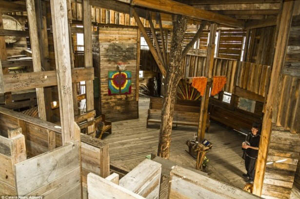 Fotografie z otevřených zdrojů Obrovský dřevěný dům obrovský o rozloze 10 000 metrů čtverečních (3 400 metrů čtverečních) Horace je velmi levný. Strávil jen 12 tisíc dolarů díky hospodárné použití materiálů a využití odpadu produkce. Uvnitř domu točitá schodiště, oltář, basketbal dětské hřiště a mnoho místností, chodby, průchody a balkony.