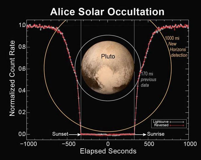 Na grafu: v určité vzdálenosti od planety číslo světlo přijaté Alice spektrografem začne prudce klesat, protože molekulární dusík v atmosféře Pluta některé absorbuje část klesajícího slunečního toku. Když se blíží na povrchu trpasličí planety je intenzita světla stále snížena ostřejší, zjevně kvůli intenzivní absorpci slunečního toku molekuly uhlovodíkových plynů v atmosféře Pluta.