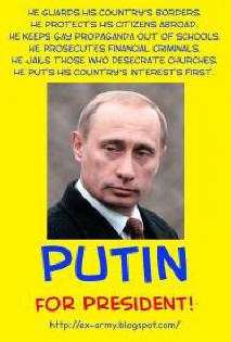 Nápisy na plakátu shora dolů: Hlídá své hranice země chrání své občany v zahraničí; zakázal ve školách gay propaganda; pronásleduje finanční zločince; zasadí do vězení těch, kdo se rouhají v církvích; klade zájmy země nad jejich vlastní. Putin prezidentovi!