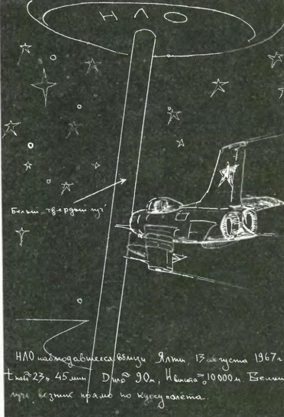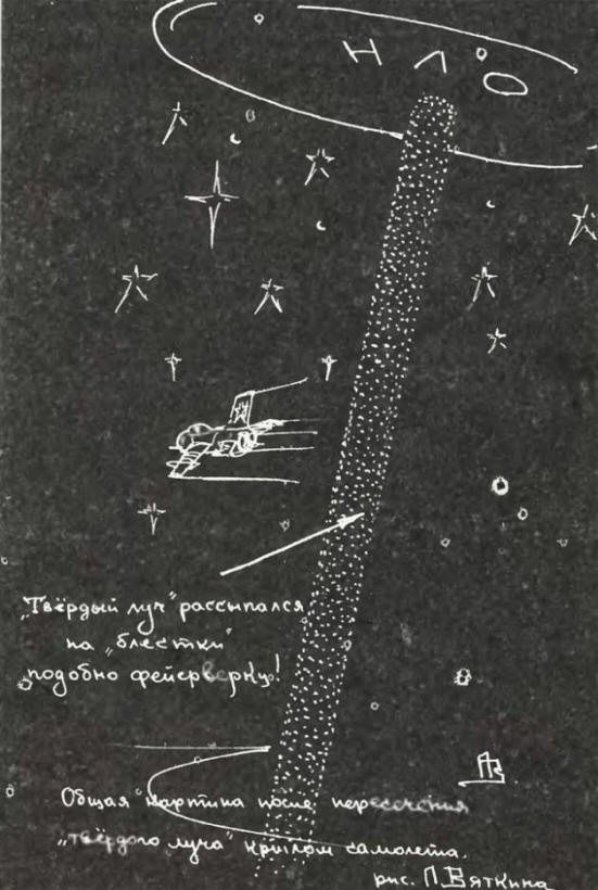 Foto z open source Říká pilot Lev Vyatkin: „Já Chtěl bych čtenářům vyprávět o některých zvláštnostech tohoto jevu UFO Budeme mluvit o takzvaném „tvrdém paprsku“, který někdy zahrnuje “destičku”. Začnu v pořádku a pokusím se neklesnout dokonce malé detaily tohoto nekonečně tajemného setkání s UFO. Setkání se stalo tentokrát ve vzduchu během nočních letů v Krym, v srpnu 1967. A to se stalo … Vzlétl jsem stíhací stíhačka pro výcvik útěk. Bylo to 23 hodin s minutami. Zapnul přídavný spalovač a vyšplhal 10 tisíc metrů. Vyjasnil svou polohu a informoval o tom letecký ředitel a jemně vstoupil do auta na odbočce vlevo … Byl noc bez měsíce. Dovoluji si to prohlásit, že to nebeské trezor, který má pilot k dispozici pro pozorování ze stratosféry, je velmi vysoký liší se od toho, co je viditelné pro člověka ze Země. Vzácný vzduch umožňuje rozlišovat mezi neuvěřitelným počtem hvězd, které nejsou blikání! Je jich tolik, že se v nich konstelace utopí. Zajímavé současně s lezení, speciální stereoskopický efekt: oko získává schopnost rozlišovat nebeské objekty pomocí odlehlost. Vize je velmi ostrá. (Tento efekt astronauti také na vědomí na oběžné dráze.) Například, Mléčná dráha a její struktura „vlákenných hvězd“ se zdá být objemná. Tenhle stereoskopický efekt a vizuální bezednost viditelného vesmíru obzvláště vzrušující a fascinující … Moje letadlo poslušně provedlo půl otáčky a nyní se podíval špičkou kabiny na moře. Hluboko pod ním se Yaltovými světly blikala ohnutá podkova. Obvykle Ovládám svědectví o leteckých nástrojích. Za obrněným křeslem šustění běžícího motoru … A v tu chvíli jsem najednou viděl, co mě pak dlouho trápilo, dělal mě znovu a znovu hledat vysvětlení toho, co se stalo. Tohle jsem viděl, když jsem vzhlédl ze spotřebičů hleděl dopředu: velký jasný objekt ve tvaru zářící oválná nebo silně vypouklá čočka se „rozštěpí“ nade mnou vlevo. Рисунки автора