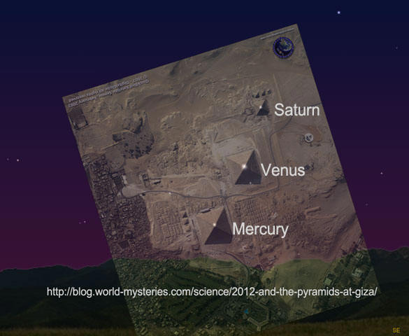 Planetární vyrovnání se bude konat 3. prosince 2012 přesně zarovnané s pyramidami v Gíze. Noční obloha v Gíze, Egypt 3. prosince 2012, místní čas … hodinu před východ slunce ve srovnání s pyramidami v Gíze. Obrázek vytvořené pomocí počítačového programu Starry Night Pro (např stejný druh planet lze získat pomocí jakéhokoli jiného programu astronomie, například Stellarium). Přidat obrázek pro Planetární Zarovnání 3. prosince 2012 bylo potvrzeno