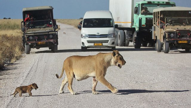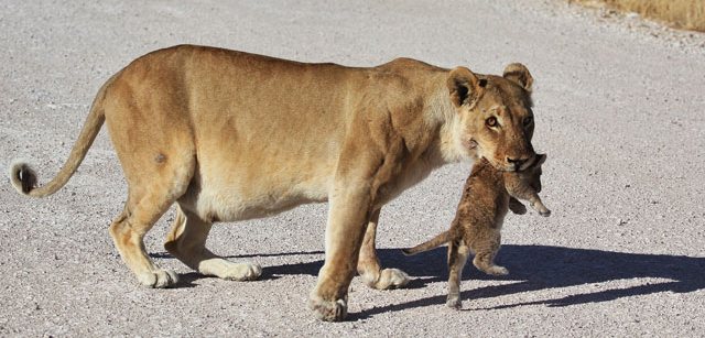 Jak si lidé všimli, byla auta nucena zastavit lvice a lvíče se snaží překročit trať. Kdy ale zvířata se vydala na cestu, zájem o mládě v bezvědomí auta – zvědavost vzrostla. Matka se musela vrátit a vezme lvíče kočičího lva za zátylku na krku, vezme ho na obrubník dovnitř zuby – daleko od ohromených a dokonce i trochu vyděšených lidí.