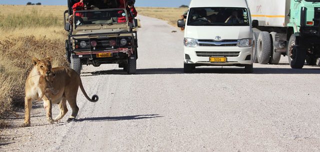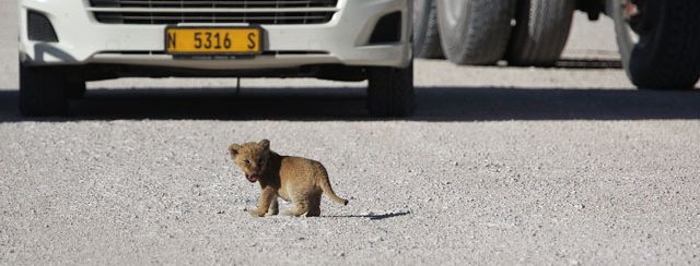 Tyto jedinečné záběry pořídil řidič auta Matthew Weaver, který byl svědkem Národního parku Etosha Namibijské národní parkové kolonie postrádaly lvice se svými mláďaty přes silnici. Řidiči současně sledovali se zakousnutým dechem vývoj téměř tragické situace.