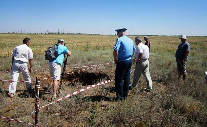 Země byla ukradena na státní farmě Samarsky v Kazachstánu Okres Atbasar. Příznaky zůstaly nezměněny: pět metrů průměr jámy, ideální tvar a nepřítomnost zemních skládek. Možná je to stopa rakety? První lidé v Kazachstánu Považovali to tak, protože nedaleko státní farmy nachází se vojenská základna. Tato teorie však musela zahodit, pokud základní personál neuznal jejich zásah. Plukovník Gromov však provedl šetření a uvedl, že Na scéně nebylo nalezeno žádné záření. Také armáda dospěla k závěru, že pád meteoritu také nemohl být řeč.