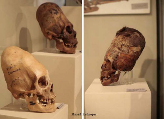 Fotografie z otevřených zdrojů Je velmi obtížné zjistit jejich věk lebky, stejně jako jejich původ. Některé z nich jsou patrné liší se od sebe navzájem. Zdá se, že oni patří k různým biologickým druhům, poněkud připomínající moderní muž. Velké velikosti a neobvyklé tvary různých lebek. Lze je rozdělit do čtyř skupiny: kónické (nebo pyramidální) lebky, dýňové, ne zcela správná forma a tzv. proto-člověk. Verze Ale to, co by živé bytosti stále mohly mít neobvyklé hlavy? Jednou z verzí vědců je to starověcí lidé vědomě deformovali lebky kojenců použitím různá zařízení. A ve skutečnosti, mnoho zemí světa předtím Nedávno existovala krutá tradice změny tvaru hlavy děti. Podlouhlý tvar hlavy byl považován za krásný. Batole s dětství pevně svázalo hlavu v čele a chrámy provazem nebo ovázané desky. Je zajímavé, že takový zvyk existoval. od různých národů, geograficky od sebe vzdálených. Vědci najít protáhlé lebky v Egyptě, Mexiku, Peru, na Maltě, severní Irák a Sýrie. Tradičně podobné lebkové změny spojené s celními zvyky lidí, kteří patří k kastám vládců nebo kněží.