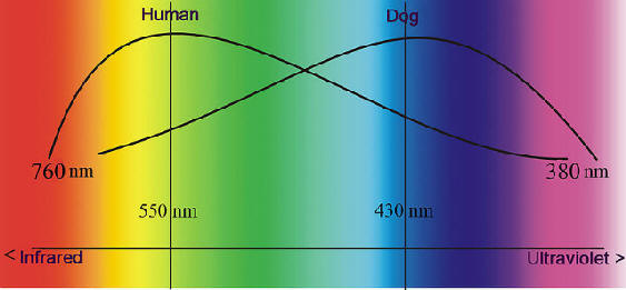 V roce 2012 americký vědec Jay Neitz z University of Washington zjistila, že vidění psů stále není monochromatický, ale vnímání barev je méně rozvinuté než u lidí. Důvodem je skutečnost, že lidé v sítnici mají tři typy fotoreceptorů kužely a u psů – pouze dva. Proto, stejně jako slepá barva, ne dokáže adekvátně vnímat červené a zelené barvy.