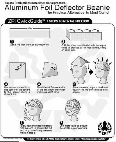 Fotografie z otevřených zdrojů Chránit před psychotronikou expozice může udělat nejjednodušší zařízení. Pamatuji si Opravdu jsem pobavil tento snímek z filmu “Signs”, ale ukázalo se, že existují taková kamufláž dává smysl. Je lepší vidět zde. Jen fólie složené do vrstev (lesklá strana nahoru a vnitřní vrstva na hlava by měla být také lesklou stranou k hlavě), potom od z obdélníku je vytvořen kužel a celá fólie je pečlivě přitlačena hlava, aby se zabránilo jakékoli mezery. Pak je vše opraveno lepicí páska. Tato čepice může být pod kloboukem, šátkem nebo paruka. Jak vypočítat počet vrstev dotazníku na fólii (zapnuto) Angličtina) pro ty, kteří se považují za psychotronické излучению
