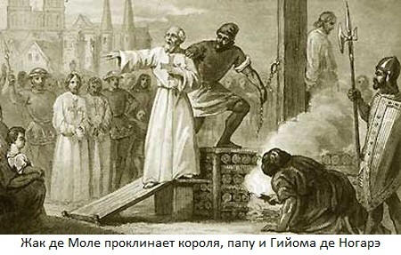 18. března 1314, po sedmi letech výslechu a mučení, 23. poslední Velmistr Řádu byl veřejně upálen. Už v klubech kouř Jacques de Molay proklel krále, papeže a rádce králi Guillaume de Nogare, který sloužil jako strážce pečeť a hrál klíčovou roli při organizaci porážky řádu. Flames de Mollet slíbila, že za necelý rok se objeví všichni tři Boží soud.