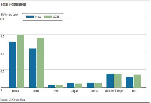 Fotografie z otevřených zdrojů Národní zpravodajská rada Spojených států vypracoval předpověď, ve které identifikoval hlavní faktory a klíč procesy, které mohou určovat budoucí události. V při přípravě prognózy Rada vzala pomoc výzkumná centra, poradenské firmy, vědecké instituce. Stovky odborníků, kteří pracují a nepracují vláda, jak v USA, tak mimo zemi, přijala účast na vývoji prognózy. Podle prognózy do roku 2025 ne zůstane jediným „mezinárodním společenstvím“ sestávajícím z národní státy. Síla je rozptýlenější mezi novými hráči hrajícími podle vlastních pravidel a také zvyšuje se riziko, že tradiční západní aliance oslabí. Čínský rozvojový model bude s větší pravděpodobností přitahovat mnoho zemí, než západní modely politického a ekonomického rozvoje. takový přechod by posílil státy jako Rusko, které chtějí zpochybnit západní řád. USA zůstanou jediným země lepší než ostatní, ale jejich dominance oslabí. Klesající ekonomické a vojenské příležitosti mohou přinutit USA, aby učinily řadu komplexních kompromisů mezi prioritami domácí a zahraniční politika. Potřeba USA fungovaly jako regionální stabilizátor ve středu Na východ, i když další vnější síly – Rusko, Čína a Indie – budou hrají větší roli než dnes. Terorismus pravděpodobně nezmizí 2025, ale jeho atraktivita by mohla být snížena, kdyby hospodářský růst na Blízkém východě pokračoval a nezaměstnanost mezi mládeží odmítl. Společné technologie padnou ruce teroristům, kteří jsou aktivní. Pokud jsou ceny ropa a plyn zůstanou vysoké, státní moc hlavního vývozci, jako je Rusko a Írán, prudce stoupnou, HDP Zároveň se Rusko může rovnat HDP Velké Británie a Francie. V Rusko má v roce 2025 potenciál stát se bohatším, silnějším a více sebevědomý, pokud investuje do lidských zdrojů, bude rozšiřovat a diverzifikovat svou ekonomiku a integrovat se do světa na trhu. Očekává se, že k žádnému jinému státu nedojde úroveň Číny, Indie a Ruska a je nepravděpodobné, že by tyto skoky opakovaly. Ostatní země v ekonomické sféře ještě více zaostávají. Okres Subsaharská Afrika bude i nadále nejzranitelnější vůči ekonomice zhroucení, napětí ve společnosti, občanské konflikty a politická nestabilita. Do roku 2025 je příjem mnoha zemí Latinská Amerika vzroste na průměrnou úroveň, ostatní státy, zejména ve Venezuele a Bolívii za sledované období, zůstanou pozadu a někteří, jako je Haiti, budou ještě chudší a bude ještě méně citlivý. Celkově latina Amerika bude zaostávat za Asií a dalšími rychle rostoucími zeměmi regiony z hlediska hospodářské konkurenceschopnosti. V v příštích dvaceti letech mohou být Asie, Afrika a Latinská Amerika počítat s růstem celé populace; na Západě bude nárůst méně než tři procenta. USA budou v regionu výjimkou stárnoucí populace v rozvinutých zemích, jak přežívají zvýšení porodnosti a imigrace. Pravděpodobně se zvýší počet migrantů, kteří se chtějí přestěhovat z nefunkčního do relativně příznivé země. Populace v Číně, Indii, Íránu, Japonsko, Rusko, západní Evropa a Spojené státy podle plánu budou vypadat takto: