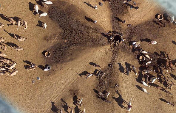 Lidé a velbloudi u zdroje vody v Nigérii