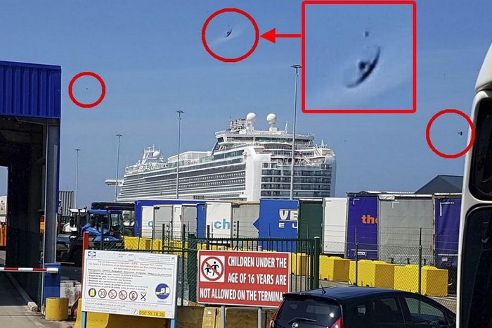 To se stalo v Belgii v přístavu Zeebrugge. Britové turista, který dělá evropskou plavbu z Southamptonu do Zeebrugge, fotografování přístavu z okénka okružního autobusu, náhodně zachyceného v objektivu smartphonu visí „létající talíř“ (nebo létání) přes linii.