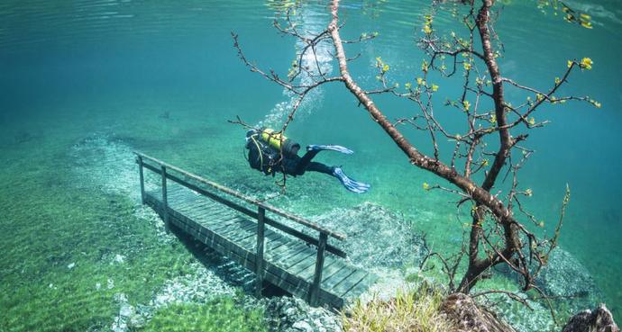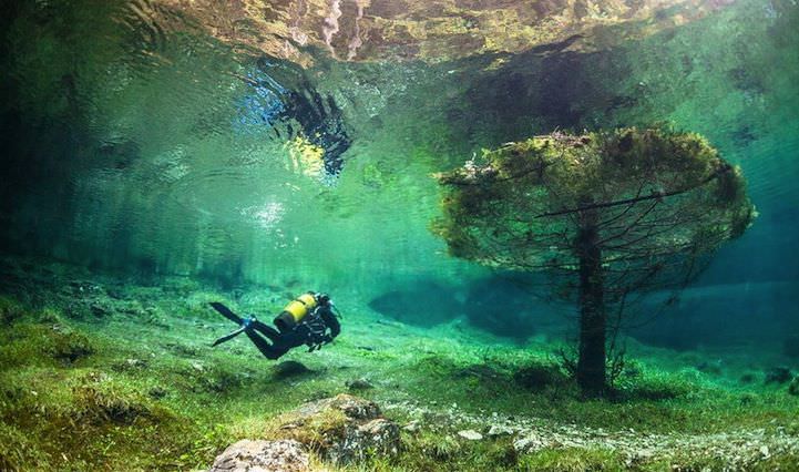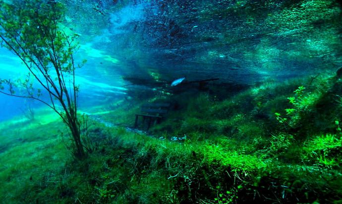 Dno Zeleného jezera bylo speciálně vybaveno lavicemi, mosty, stezky a vysazeny stromy tak, aby turisté po dobu šesti měsíců si mohl užít malý zázrak v podobě podvodního parku.