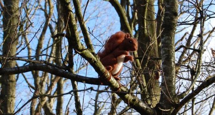 Pletená veverka sedí vysoko na stromě a zvědavě se dívá hosté. Je škoda, že v lese nejsou žádné pletené ořechy ji.