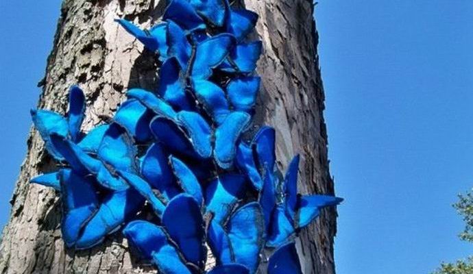 Přestože jasně modré motýly na stromě nebyly spojeny, však všechny Stejně harmonicky zapadá do instalace.