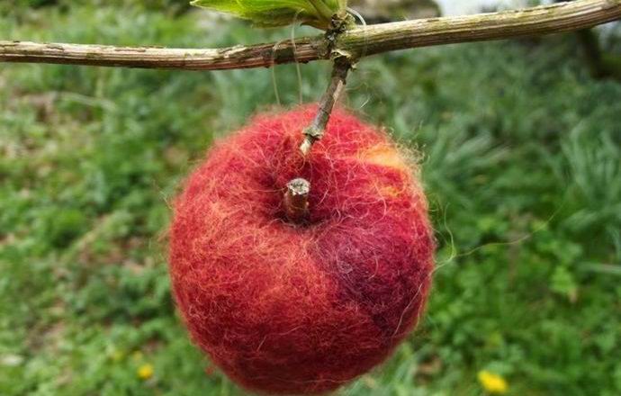 Pletené jablko vypadá jako dárek – chcete ho jen vytrhnout větve.
