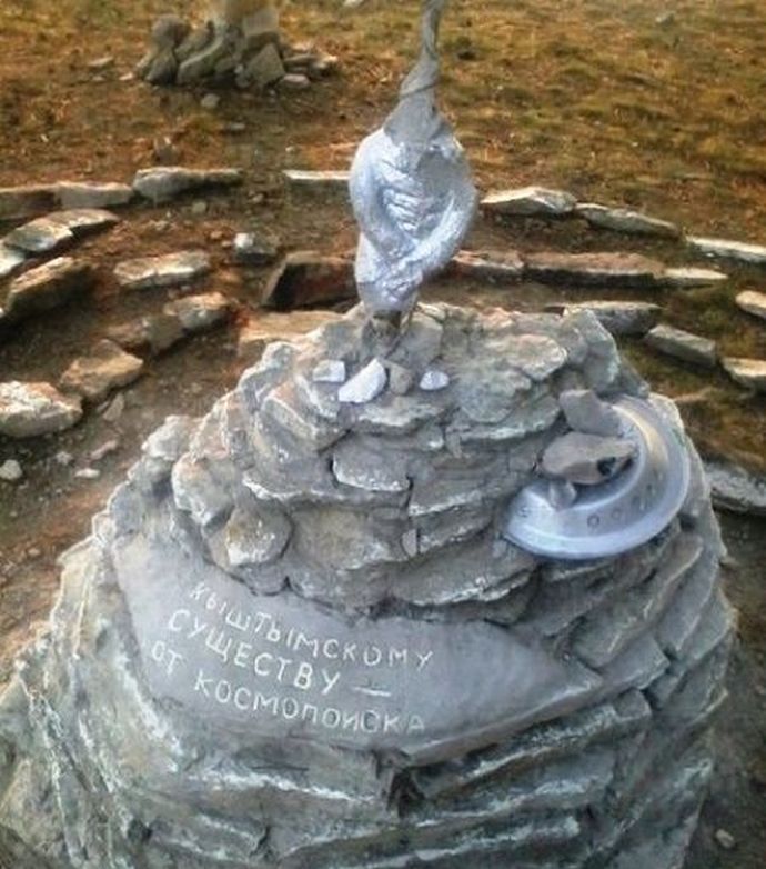 Pomník malého mimozemšťana byl vytvořen v přirozeném stavu hodnota podle fotobotu sestaveného najednou Chernobrovem podle Podle očitých svědků této události. A tak to bylo neobvyklé stavba na jezeře Anbash. Členové expedice se o to pokusili památník vandal důkaz Nejprve to bylo docela robustní – z kamene, betonu a železa. Za druhé, za předpokladu, že nejvíce neutrální nápis – „ke stvoření Kyshtymu – od Cosmopoisku“. Vypadalo by to vše bylo provedeno pro bezpečnost …