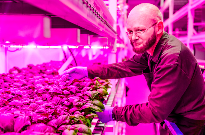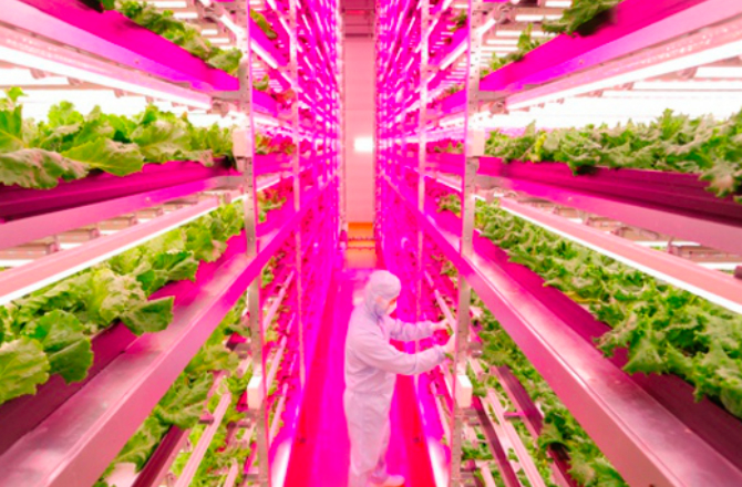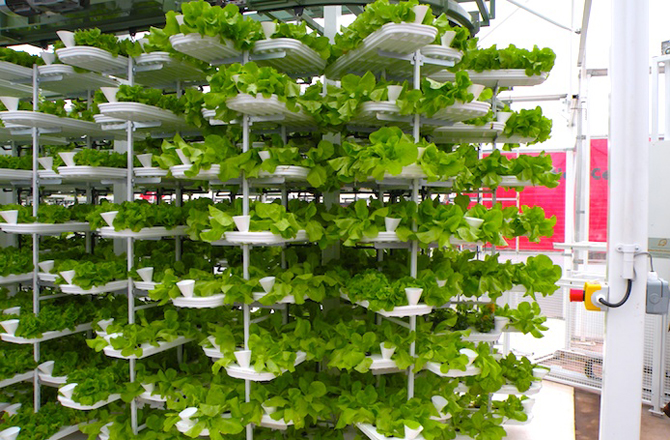 Největší vnitřní farma na světě se nachází v Japonsku. To je obrovský pokoj vybavený designem vertikálních stojanů, naplněné tenkými podnosy pro půdu. Farma produkuje 100krát více zeleniny na metr čtvereční než kterákoli jiná domácnost. Návrhář vertikální farmy vyvinul speciální diodový systém osvětlení, které řídí teplotu, vlhkost, osvětlení, a také snižuje plýtvání potravinami z 30 na 40%.