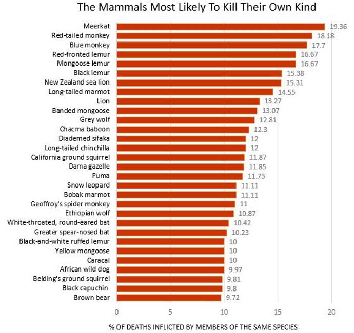 Španělští zoologové dokončili rozsáhlou studii s cílem odhalit nejkrvavějšího savce na Zemi. Vědci analyzoval chování zástupců více než tisíc druhů a vytvořil seznam třiceti tvorů, které se projevovaly nejagresivnější vůči sobě a zuřivost. Výsledky Tato studie byla publikována v renomované Británii obecný vědecký časopis “Nature”. Je pravda, že se ukázalo být docela úžasné.