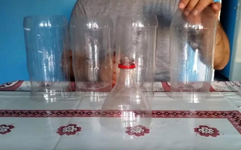 Takže ze čtyř lahví jsme seřízli dno a krk, takže tam byly ohyby k krku nejméně 2 centimetry. Ale pátý používejte pouze krk s ohybem a malou rovnou částí lahve (opět asi 2 centimetry).