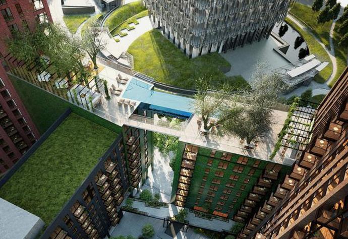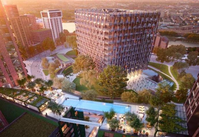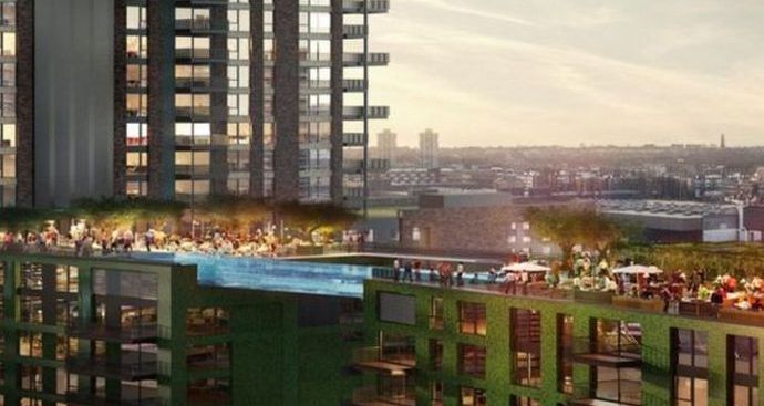 Sky Pool (nebeský bazén) se organicky vejde do rezidenčního komplexu Zastupitelské zahrady nařídil Ballymore. Postavil bude stavební společnost Arup v oblasti Nine Elms nedaleko centra Z Londýna. Tento kreativní projekt vytvořil Eckersley O’Callaghan, známý pro svůj nádherný design vývoj pro mnoho obchodů Apple – téměř v roce 2007 po celém světě.