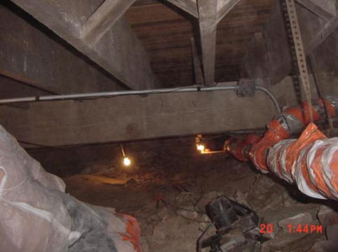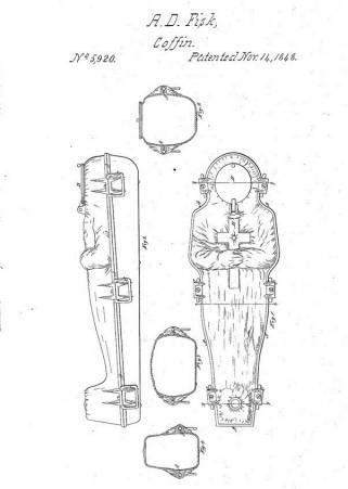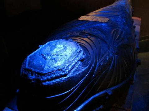 V opačném rohu je neobvyklá velká kovová rakev forma, která polovina vyčnívá ze Země.